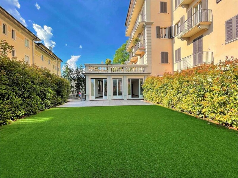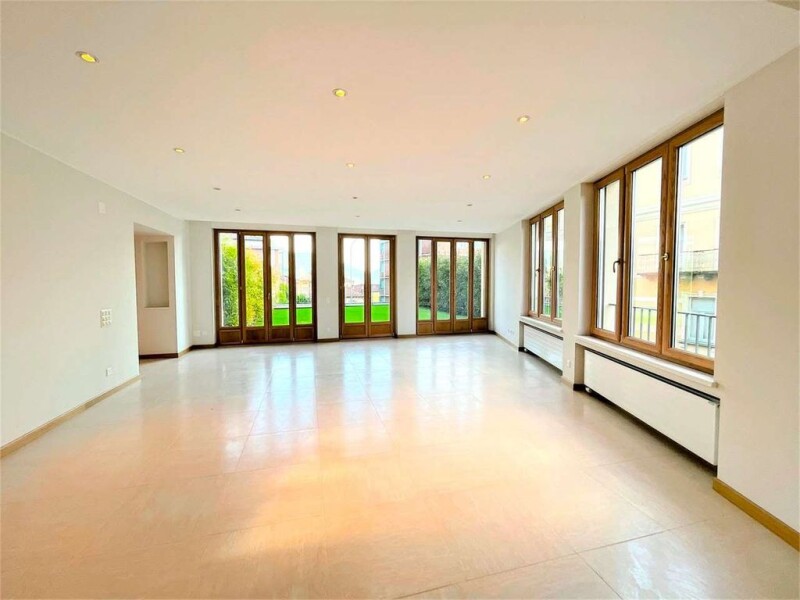 In a centrally located historical building that has been completely renovated, there is an elegant 4.5 room charming apartment of approximately 210 square meters with a porch and a garden of over 160 square meters. It is distributed as follows: - spacious entrance hall with elegant niches and spotlights - large living room with numerous windows that provide natural light to the environment, with access to the large porch and garden - separate kitchen with access to the rear garden - guest bathroom - small storage/laundry room - master bedroom with ensuite bathroom with shower, bathtub, and walk-in closet - hallway - two additional bedrooms - bathroom with shower The recent landscaping of the garden has created a meticulously maintained environment with a green carpet of grass, tall hedges in the front; while in the back, walls of ivy and stone with glass slabs have been created to add depth. The property includes a cellar, shared laundry room, and two automated parking spaces priced at CHF 75,000 each.