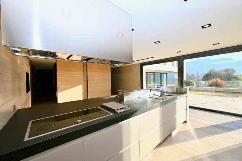 Situated in a prime location in the hills of Carona, about 7 km from Lugano city center, this extraordinary design villa offers a perfect blend of contemporary architecture, exclusive comfort and breathtaking views of Lake Lugano and the surrounding mountains. Designed and built in 2011 by two renowned architects (Angelo Pozzoli e Marco Sangiorgio), the property is a unique example of the integration of minimalism and tradition. The villa has a living area of approximately 742 m², complemented by 239 m² of panoramic terraces, a terraced garden of 1'925 m², a beautiful indoor swimming pool and a large building land of 1'000 m² in front of the villa. A garage of about 65 m² with capacity for 3-4 vehicles and additional outdoor parking spaces for guests. The building is designed as a harmonious fusion of two distinct volumes: - A minimalist body of exposed reinforced concrete, an expression of contemporary elegance. - A second body in natural stone, conceived as a telescope that runs perpendicular to the first, enhancing the perspective and panorama. - The central element is a dramatic internal staircase connecting the three levels of the residence, a true architectural masterpiece that enhances the verticality and interaction between spaces. Second Floor (Entrance) - approx. 196 m²: Spacious entrance hall with access to the main staircase, checkroom and hallway. The sleeping area includes: - A master bedroom with panoramic terrace, private checkroom and en-suite bathroom. - Two additional bedrooms with respective bathrooms. First Floor - approx. 253 m²: A spacious bright living area, divided by a central double-sided fireplace, separating the living room from the dining area. This floor includes: - An eat-in kitchen with dining area and TV room. - A guest toilet, storage room and a large rooftop terrace with roof garden. Ground Floor - approx. 292 m²: Divided into two distinct areas: - Wellness Area: Large indoor pool, sauna, bath, relaxation area with large covered terrace and technical room. - Service Area: Includes a small independent apartment (living-room, kitchenette and bathroom), laundry and cellar. Finishes and Technology: The villa is finished with the highest quality materials, with attention to the smallest details: - Layered oak floors, treated with natural oils and waxes. - Handcrafted cementino staircase, an innovative material. - Bathrooms and living walls finished with an exclusive "sandblasted patina" treatment with elegant tones. - Outdoor terraces with natural stone slats. - Home automation lighting with sophisticated solutions: recessed spotlights, linear cuts and LED diffused light. - Interior "sail" doors with bidirectional opening. The surrounding garden, designed down to the smallest detail, is home to a wide variety of trees, shrubs and flowers, creating striking scenery and providing absolute privacy and spaces dedicated to relaxation. Floor-to-ceiling windows, panoramic terraces, and fine finishes make this villa a unique home that offers an extraordinary living experience. A rare opportunity for those who wish to experience contemporary luxury in one of the most fascinating locations in Canton Ticino. Total price: CHF 7'400'000.- (CHF 6'400'000.- for a villa + CHF 1'000'000.- for a building plot of 1'000 m2).